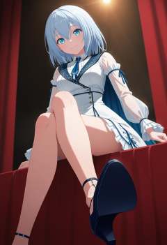 masterpiece,best quality,ultra-detailed,very aesthetic,sharp focus,vibrant colors,ray tracing,best lighting,detailed illustration,detailed background,cinematic,general,sensitive,explicit,neon,light,vibrant colors,glow,score_9,score_8_up,score_7_up,source_anime,looking_down,from_below,sit on the edge of the stage,stage,concert,sound,voicevox,red curtain,soft shadows,soft natural lighting,dramatic lighting,(rich tones:0.9),low angle,(gradient:1.1),looking_at_viewer,smile,(darkness:1.5),(foot focus:1.1),front view,crossed_legs,<lora:仓田真白msr:1>,blue eyes,hair between eyes,light blue hair,medium hair,diyitao,blue necktie,blue ribbon,frilled sleeves,long sleeves,medium breasts,puffy sleeves,see-through sleeves,white dress,white skirt,dark blue heels,dark blue anklet,long clear blue one-shoulder cape,
