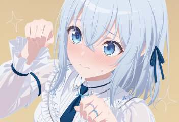 masterpiece,best quality,very aesthetic,absurdres,newest,no lineart,portrait,1girl,close-up,from above,flat color,upper body,hand frame,eye focus,sparkle,<lora:仓田真白msr:1>,blue eyes,hair between eyes,light blue hair,medium hair,only one ring,blush,flustered,cat_pose,diyitao,blue necktie,blue ribbon,frilled sleeves,long sleeves,puffy sleeves,see-through sleeves,white dress,