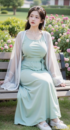 (masterpiece, best quality:1.2),A beauty wearing a pearl hairband dons a long dress, paired with a light cyan sheer knitted cardigan and white Mary Jane shoes. Leaning on a garden bench filled with macaron - colored flowers,.Sunlight filters through the leaves onto her face, creating a lazy and gentle atmosphere, and her skirt sways softly in the breeze. 8K resolution, detailed texture of knitted fabric, lustrous pearl texture, vivid flower colors, soft natural light, Instagram - style filter texture.,(huge breasts:2.99),(full breasts:2.99),Xnanxiaochen,Xloubeimaoyi,Xrixisheyingfeng,Xnaiqishuiyi,Xzhaoxianger