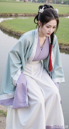 masterpiece, best quality, A girl in Wei - Jin - style Hanfu is by a gurgling stream, bending down to gently touch the water with a comfortable expression. The clothing is in light colors, mainly light blue and lavender. It has a crossed - collar and right - lapel design, and the cuffs are inlaid with delicate lace. The background is the clear stream and wildflowers blooming by the stream, (huge breasts, full breasts)