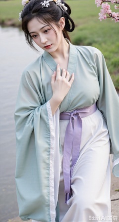 masterpiece, best quality, A girl in Wei - Jin - style Hanfu is by a gurgling stream, bending down to gently touch the water with a comfortable expression. The clothing is in light colors, mainly light blue and lavender. It has a crossed - collar and right - lapel design, and the cuffs are inlaid with delicate lace. The background is the clear stream and wildflowers blooming by the stream, (huge breasts, full breasts)