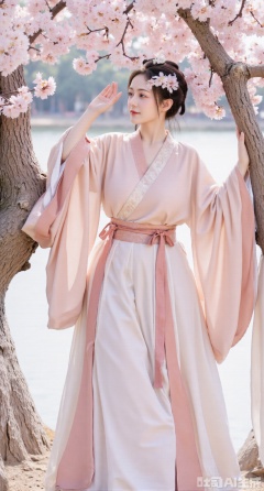 masterpiece, best quality, A girl in Wei - Jin - style Hanfu is standing under a peach tree. As the breeze blows, peach blossoms flutter down. She reaches out to catch the petals, with a smile on her face. The Hanfu is light pink, echoing the peach blossoms. The cuffs are wide, and a belt of the same color is tied around her waist. The background is a magnificent peach blossom forest, (huge breasts, full breasts)