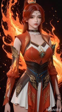 general, sfw, 1female, Dark brown eyes, red_hair, solo, breast, exquisite skin, looking at viewer, cowboy_shot, very awa, Glossy and Flame background