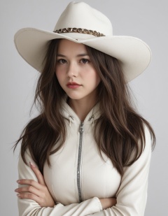 lishuting,\(shirley\),lishuting,1girl,solo,photo,realistic,hood,brown hair,crossed arms,hat,white background,belt,looking at viewer,white headwear,long hair,brown eyes,simple background,cg,hood down,lips,white leotard,realistic,fingernails,long sleeves,upper body,hooded jacket,zipper,closed mouth,red lips,breasts,cowboy hat,jacket,