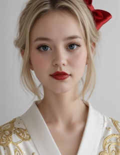 a close-up shot of a woman's faceadorned with red lipstick. Her eyes are adorned with eye lashesadding a pop of color to the scene. Her blonde hair cascades over her shouldersframing her entire face. She is adorned with a white kimono adorned with gold embroidery and a red bow at the neckline. The woman's lips are painted a vibrant shade of redwhile her hair is a richglossy white. The backdrop is a mix of white and redcreating a striking contrast to the woman's outfit.