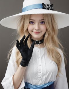 masterpiece,soft lighting,best quality,amazing quality,very aesthetic,newest,absurdres,1girl,black collar,black gloves,blonde hair,blue sash,blurry foreground,closed mouth,collar,gloves,hair ornament,hand up,hat,long hair,looking at viewer,purple eyes,sash,shirt,smile,solo,white hat,white shirt,x hair ornament,realistic,photorealistic,