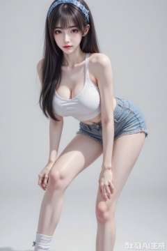 Masterpiece, best quality, high quality, (black hair: 1.4), (long legs :1.4),AIAHZ,1girl, solo, long hair, (huge breasts:1.5),1girl, solo, long hair, breasts, looking at viewer, bangs, blue eyes, blonde hair, navel, cleavage, medium breasts, very long hair, standing, collarbone, full body, hairband, shoes, shorts, socks, midriff, nail polish, short shorts, leaning forward, white socks, wristband, sneakers, blue footwear, sports bra, blue hairband, hand on own thigh