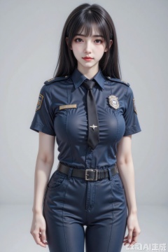 Masterpiece, the best quality, high quality, huge breasts,,(black hair:1.4),(long legs:1.3),(thin legs:1.4),1girl, Masterpiece, the best quality, high quality, small breasts,,(black hair:1.4),(long legs:1.3),(thin legs:1.4),1girl, breasts, long hair, shirt, black hair, sweat, necktie, belt, pants, armpits, uniform, multiple views, watermark, vest, blue shirt, black belt, blue pants, police, police uniform, policewoman