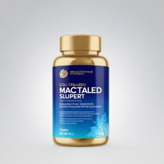 (Black glossy plastic bottle with smooth and reflective surface:1.3), (solid texture:1.3), (black spiral bottle cap with slight matte texture:1.2), (highlights reflecting natural light from upper left:1.2), (rounded bottle shape with seamless connection between cap and body:1.3), (front label with blue gradient background changing from dark blue to light blue:1.3), (metallic luster on the gradient:1.2), (brand logo "hebalma" in stylish sans serif font:1.2), (green and blue leaf patterns surrounding the brand logo:1.1), (main title "NEW, GELATINIZED MACA" in bold white font with slight 3D effect:1.3), (metallic blue border around the text:1.2), (sub-title "COLD PROCESSED TO PRESERVE NUTRIENTS" in bright gold font to enhance luxury:1.3), (function description area with small white font, evenly arranged:1.1), (describing effects of enhancing energy, improving endurance, and ************ support:1.1), (bottom information in black and blue rectangular background blocks:1.2), (white font indicating "120 Capsules," "500 mg per capsule," "1.6 Concentration":1.2), (neat and clear layout:1.2), (label on the right displaying "Supplement Facts" in black font on white background with subtle gray border:1.2), (simple and clear layout with slight glossy border around the label, enhancing visual hierarchy:1.2), (overall style is modern and technological, suitable for high-end sports nutrition market positioning:1.2), (bottle conveys a professional and reliable impression:1.1), (overall design exudes power and has an attractive display effect, suitable for 3D product display on e-commerce platforms:1.2).