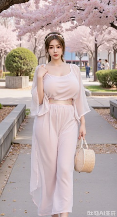 masterpiece, best quality, On a late spring peach grove path, a girl wears a pale pink peach-blossom bellyband under a matching sheer chest-high dress, paired with flesh-toned sheer stockings, carrying a bamboo basket. The slightly low neckline reveals her full bust, a thin gauze belt cinching her waist. Her silk-stockinged legs glimmer through falling petals, hips swaying gently, with blurred pink blossoms and stone paths creating a romantic spring scene., (huge breasts, full breasts),Xhanfududou