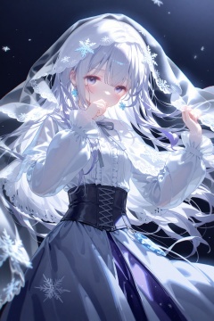 masterpiece,very aware,highres,absurdres,newest,best quality,loli,petite,high quality,chromatic_aberration,cinematic_angle,dutch angle,nyalia,//,artist:ciloranko,artist:ningen_mame,artist:sho_(sho_lwlw),artist:rhasta,artist:wlop,artist:ke-ta,artist:hiten \(hitenkei\),//,1girl,solo,long hair,long sleeves,looking at viewer,hair ornament,veil,skirt,snowflake hair ornament,shirt,center frills,frills,corset,white shirt,very long hair,blurry,blush,chromatic aberration,grey eyes,dress,hair between eyes,puffy long sleeves,white hair,neck ribbon,sleeves past wrists,black corset,depth of field,ribbon,see-through,grey hair,purple skirt,grey skirt,white theme,white ribbon,long skirt,tears,blue eyes,high-waist skirt,cross-laced clothes,hands up,purple hair,blurry foreground,hand on own face,floating hair,mole,white background,grey theme,dutch angle,closed mouth,blurry background,purple eyes,virtual youtuber,crying,light particles,puffy sleeves,album cover,frilled shirt,frilled sleeves,watermark,mole under eye,english text,covered mouth,jewelry,crying with eyes open,snowflakes,artist name,arms up,purple dress,grey ribbon,bow,white bow,flower,blue skirt,standing,capelet,cowboy shot,backlighting,grey nails,simple background,covering own mouth,hair flower,cover,hand up,earrings,wind,small breasts,snowflake print,blouse,smile,white veil,sidelocks,bowtie,expressionless,white eyes,hand on own cheek,blue theme,tearing up,
