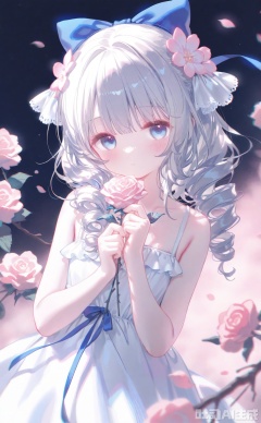masterpiece,very aware,highres,absurdres,newest,best quality,loli,petite,high quality,chromatic_aberration,cinematic_angle,dutch angle, nyalia, //,artist:ciloranko,artist:ningen_mame,artist:sho_(sho_lwlw),artist:rhasta,artist:wlop,artist:ke-ta,artist:hiten \(hitenkei\),//,1girl, solo, looking at viewer, bangs, blue eyes, hair ornament, dress, bow, ribbon, holding, bare shoulders, closed mouth, flower, hair bow, grey hair, hair flower, white dress, rose, drill hair, pink flower, branch, holding flower
