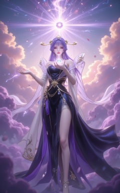 <lora:天穹·8:1.1>,tianqiong,1girl,dress,solo,purple hair,purple eyes,hair ornament,long hair,bare shoulders,The dawn light fractures through the clouds,crowning her in divine amethyst radiance. Violet tresses cascade like nebulae,their diamond-studded ends scattering stardust with every movement. The lavish skirt blooms like midnight irises in the sea of clouds,while crystal heels suspend prismatic halos beneath her silk-stockinged legs.,Cupping a sphere of sunlight in her palms,she floats amidst swirling violet energy that weaves ancient runes in the air. Shot from a reverent low angle,the 8K resolution captures every exquisite detail—from the morning dew on her lashes to the hidden embroidery on her gown—transforming the scene into a living masterpiece.,cover,gradient background,close-up details,outstanding style,adding a touch of dimension to your images without compromising details,close-up,<lora:DJ滤镜_2.5D版:0.2>,lvjing,<lora:滤镜·绚丽多彩·再优化12:0.3>,lvjing,