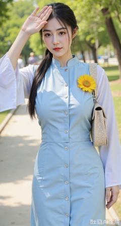 (masterpiece:1.2),best quality,,The image is a high-resolution photograph featuring a young Asian woman standing outdoors on a sunny day. She has a fair complexion and long,straight dark brown hair styled in a single braid that drapes over her left shoulder. Her bangs are straight and frame her face. She is wearing a light blue,sleeveless dress made of a soft,textured fabric with a high neckline and a button-down front. The dress is paired with a long-sleeved white blouse underneath,adding a layer of warmth and elegance.,