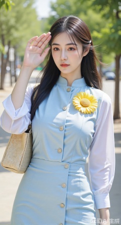She holds her right hand up to shield her eyes from the sun,casting a gentle shadow over her face. A large,yellow sunflower brooch adorns her left shoulder,adding a pop of color and a playful touch to her outfit.,