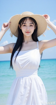 (masterpiece:1.2),best quality,This is a vibrant,high-resolution photograph capturing a young Asian woman standing on a beach. The subject is centered in the frame,facing the camera with a gentle,radiant smile. She has long,straight black hair with bangs framing her face,and her skin is fair with a natural,healthy glow. She is wearing a light,airy,sleeveless white dress made of a soft,flowing fabric that gently drapes over her slender physique. The dress has a slightly translucent quality,allowing a hint of her skin to show through.,