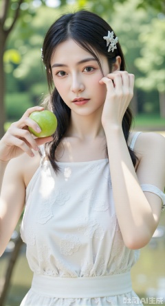 (masterpiece:1.2),best quality,Soft light photography,A young Asian woman with black wavy long hair wearing two star hair clips on either side of her ears,dressed in a white halter dress; her right hand holds a green apple lightly touching her cheek,with glistening water droplets; the background is a blurred summer forest with soft light spots formed by sunlight filtering through the leaves,creating a soft focus effect. Half-length portrait,composed slightly to the left center,with a fresh and low saturation tone and a natural sweet atmosphere,imitating Fujifilm style. --ar 3:4 --style raw,,(huge breasts:2.99),(full breasts:2.99),Xyunxiao,XyunxiaoYK,Xdixionglianyiqun,Xmiaozufushi,Xqilinxianzi,XTifaLockhart,Xjinshenjianshenfu,Xbigbreasts,Xrixirenxiangsheying,XzhaoxiangerX,Xnanxiaochen2,Xyinyue2,Xchenjiajia,Xhanfusiwa,Xmengru,Xweijinfenghanfu