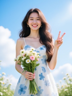 plnjsas,a young woman with long, wavy brown hair, wearing a white dress with a blue and white floral pattern, holding a bouquet of white and pink flowers, smiling and making a peace sign with her right hand. She is standing outdoors with a bright blue sky and fluffy white clouds in the background. The lighting is bright and natural, creating a cheerful atmosphere. The woman has a slender physique and fair skin. The image has a soft, dreamy quality with a focus on the woman's cheerful expression.<lora:S-T-唯美人像-610-S1.3:1>