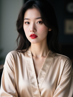 plnjsas,a young Asian woman with fair skin, dark hair, and red lipstick. She has a serious expression and is looking directly at the camera. The lighting is soft and natural, highlighting her features. She is wearing a beige silk robe draped over her shoulders. The background is blurred, focusing attention on her face and upper body. The image has a high quality and professional feel.<lora:S-T-唯美人像-610-S1.3:1>