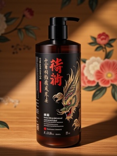 mztsas, a bottle of shampoo with a black label featuring a gold dragon design and Chinese characters. The bottle is placed on a wooden surface with a floral pattern, casting a shadow on it. The label also has the words "Shampoo and Antioxidant" written in red. The background is blurred, focusing attention on the bottle. The lighting is soft and warm, highlighting the intricate details of the design.<lora:S-T-美妆场景-S1.3:1>