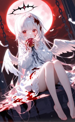 masterpiece,very aware,highres,absurdres,newest,best quality,loli,petite,high quality,chromatic_aberration,cinematic_angle,dutch angle, nyalia, //,artist:ciloranko,artist:ningen_mame,artist:sho_(sho_lwlw),artist:rhasta,artist:wlop,artist:ke-ta,artist:hiten \(hitenkei\),//,loli,1girl,wings,solo,halo,barefoot,long hair,food,feathers,blood,dress,feathered wings,sitting,white dress,angel wings,holding food,red eyes,blood on clothes,holding fruit,fruit,chain,angel,feet,pink hair,moon,holding,apple,blood on face,looking at viewer,toes,full moon,white wings,blush,bangs,child,very long hair,female child,night,long sleeves,full body,open mouth,cuffs,bare legs,legs,blood on hands,white hair,blunt bangs,frills,blood in hair,white