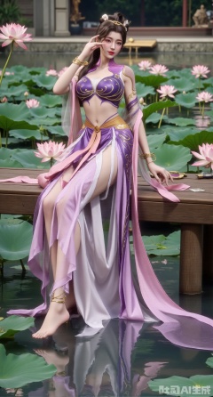 (masterpiece:1.2),best quality,The image is a digital illustration of a young woman sitting on a wooden bench in a pond with lily pads. She is wearing a long dress with design on the chest and sleeves. The dress has a high neckline and short sleeves,Holding a lotus in hand. She has long dark hair styled in loose waves and is wearing gold high heels. The woman is posing with one hand on her hip and the other resting on the edge of the bench. The background is filled with pink and white lotus flowers and green leaves. The overall mood of the image is peaceful and serene,(huge breasts:2.99),(full breasts:2.99),(Background with traditional Chinese architecture, lotus pond and pink lotus flowers:1.39),,XyunxiaoYK,Xbigbreasts,Xrixirenxiangsheying,Xmengru,XfuqingyunY