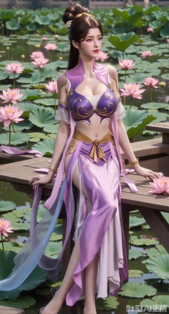 (masterpiece:1.2),best quality,The image is a digital illustration of a young woman sitting on a wooden bench in a pond with lily pads. She is wearing a long dress with design on the chest and sleeves. The dress has a high neckline and short sleeves,Holding a lotus in hand. She has long dark hair styled in loose waves and is wearing gold high heels. The woman is posing with one hand on her hip and the other resting on the edge of the bench. The background is filled with pink and white lotus flowers and green leaves. The overall mood of the image is peaceful and serene,(huge breasts:2.99),(full breasts:2.99),(Background with traditional Chinese architecture, lotus pond and pink lotus flowers:1.39),,XyunxiaoYK,Xbigbreasts,Xrixirenxiangsheying,Xmengru,XfuqingyunY