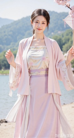 masterpiece, best quality, In spring, a beautiful girl in Song - style Hanfu, wearing a light - pink beizi paired with a moon - white hundred - pleated skirt, strolls through a peach blossom forest in full bloom. The beizi is embroidered with delicate peach blossom patterns, echoing the surrounding environment. She holds a butterfly kite in her hand, with a cheerful smile on her face. The breeze gently blows, making her hair and skirt flutter. In the distance, there are green mountains and clear waters, forming a vibrant spring picture, (huge breasts, full breasts),Xhanfududou,Xsongzhihanfu