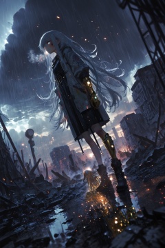 masterpiece,best quality,amazing quality,very aesthetic,absurdres,newest,in the style of fashion photography,light particles,cinematic lighting,Visual impact,sharp focus,Emotionalization,depth of field,dynamic pose,dutch angle,extreme aesthetic,scenery,(dino_(dinoartforame):0.5),(yoneyama mai:0.5),(Yomu:0.3),(quasarcake:0.5),(wlop:0.5),1girl,the girl is in the ruins,the terrible blizzard cover the ground,breathing fast,hot,shivering,injured,one hand covering the other,mechanical arm,steampunk,gold_skin,colorful clothes,dusty appearance,despair,looking at the sky,clouds,rain,rain dripping on the face,cyberpunk,dirty,broken,silver hair,very long hair,silver hair glowing metallic,hair exploding,