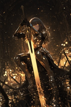 masterpiece,best quality,amazing quality,very aesthetic,absurdres,newest,extreme aesthetic,in the style of fashion photography,light particles,cinematic lighting,Visual impact,sharp focus,Emotionalization,depth of field,dutch angle,scenery,intense light,golden light in the dark,girl holding the sword,tight armor,intricate textures,real metal material,