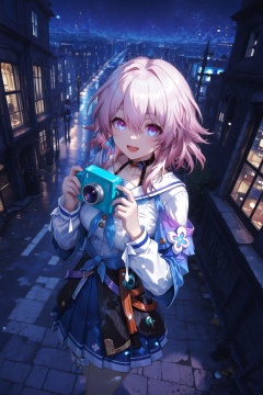 masterpiece,best quality,amazing quality,very aesthetic,absurdres,newest,dutch angle,extreme aesthetic,scenery,cute painting style,dark,1girl,cowboy shot,standing,march 7th \(honkai: star rail\),open mouth,smile,holding camera,outdoors,city,street,night,night sky,from_above,school_uniform,