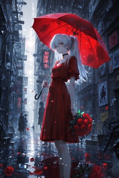 yoneyama mai:0.365,souryuu asuka langley,masterpiece,best quality,amazing quality,very aesthetic1girl,long hair,looking at viewer,dress,ribbon,holding,green eyes,hair ribbon,ponytail,flower,white hair,short sleeves,choker,pointy ears,red ribbon,petals,rose,umbrella,red dress,red flower,rain,red rose,bouquet,holding umbrella,holding bouquet,depth of field,light particles,lens flare,(artist:quasarcake:0.8),extreme aesthetic,(wlop:0.6),wanke,rella,wanke,masterpiece,best quality,good quality,newest,year 2024,year 2023,very aesthetic,absurdres,Visual impact,Electromotive force,perspective composition,A shot with tension,ultra-high resolution,32K UHD,sharp focus,best quality,masterpiece,Emotionalization masterpiece,unconventional supreme,masterful details,with a high end texture,in the style of fashion photography,(Visual impact:1.2),giving the poster a dynamic and visually striking appearance,impactful picture,offcial art,colorful,splash of color,movie perspective,masterpiece,best quality,amazing quality,very aesthetic,absurdres,best quality,newest,qxsy,