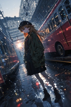 yoneyama mai:0.365, souryuu asuka langley, masterpiece,best quality,amazing quality,very aesthetic,absurdres,newest,extreme aesthetic,in the style of fashion photography,light particles,cinematic lighting,Visual impact,sharp focus,Emotionalization,depth of field,dutch angle,scenery, 1girl, solo, looking at viewer, skirt, hat, jacket, braid, outdoors, ground vehicle, motor vehicle, train