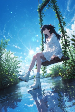 masterpiece,best quality,amazing quality,very aesthetic,absurdres,newest,in the style of fashion photography,light particles,cinematic lighting,Visual impact,sharp focus,Emotionalization,impactful picture,lens flare,depth of field,dynamic pose,dutch angle,extreme aesthetic,scenery,yoneyama mai:0.365,souryuu asuka langley,1girl,solo,black hair,dress,sitting,outdoors,sky,day,water,blue sky,white footwear,plant,scenery,reflection,vines,swing,