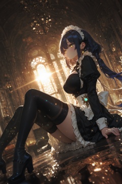 masterpiece,best quality,amazing quality,very aesthetic,absurdres,newest,in the style of fashion photography,light particles,cinematic lighting,Visual impact,sharp focus,Emotionalization,impactful picture,lens flare,depth of field,dynamic pose,dutch angle,extreme aesthetic,scenery,1girl,large breasts,black thighhighs,cyan_hair,low_twintail,long_hair,gold_eyes,maid,gold earrings,