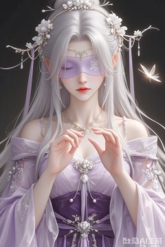 This is a digital painting in a fantasy style, depicting a fair-skinned, ethereal woman with long, flowing white hair adorned with delicate white flowers and ribbons. She wears a translucent, lavender blindfold with lace patterns, covering her eyes, and an off-the-shoulder, lavender gown embellished with floral embroidery and lace. Her lips are a soft pink, and she has a serene, almost melancholic expression. She is holding a ring delicately with her right hand near her face, while her left hand rests gently on her chest. A small, glowing butterfly hovers near her head. The background is a dark, gradient black, highlighting her luminous presence. The overall texture is soft and delicate, with a dreamlike, almost otherworldly atmosphere.
