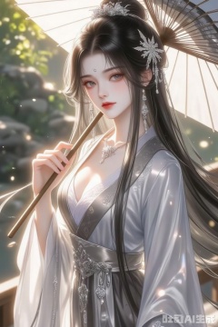 This is a highly detailed digital illustration of an ethereal East Asian woman with long, black hair adorned with silver snowflake hairpins. She has pale skin, red lips, and delicate, almond-shaped pink eyes. She wears a silver, semi-transparent kimono with intricate patterns and a low-cut neckline, revealing a hint of cleavage. Her right hand holds a traditional Japanese umbrella, while her left hand rests near her chest. She wears elegant silver earrings and a matching necklace. The background is a softly focused, sunlit garden with greenery and scattered light particles, creating a dreamy, serene atmosphere. The overall style is realistic with a touch of fantasy, emphasizing her beauty and grace.