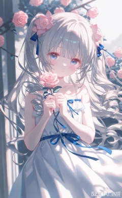 masterpiece,very aware,highres,absurdres,newest,best quality,loli,petite,high quality,chromatic_aberration,cinematic_angle,dutch angle, //,artist:ciloranko,artist:ningen_mame,artist:sho_(sho_lwlw),artist:rhasta,artist:wlop,artist:ke-ta,artist:hiten \(hitenkei\),//,1girl, solo, looking at viewer, bangs, blue eyes, hair ornament, dress, bow, ribbon, holding, bare shoulders, closed mouth, flower, hair bow, grey hair, hair flower, white dress, rose, drill hair, pink flower, branch, holding flower