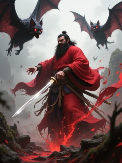 gfs, A dramatic digital illustration depicts a fierce, bearded warrior with a flowing red kimono, wielding a gleaming katana. He stands amidst a misty, ancient Japanese setting with two menacing black bats with red eyes flying above. The scene is dynamic and intense, showcasing traditional Japanese aesthetics with modern digital art techniques.<lora:S-T-国风玄幻-S1.4:1>