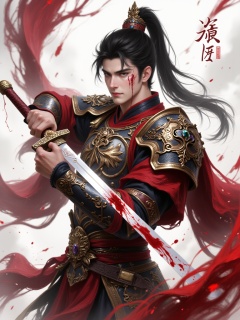 gfs, blood, armor, blood on face, ponytail, weapon, chinese clothes, holding weapon, blood on weapon, sword, holding sword, sfw, solo, 1boy, blood on clothes, holding, male focus, blood on clothes, blood on arm, long hair, bloody face, traditional chinese clothes, blood on arm, blood on body, bloodstained<lora:S-T-国风玄幻-S1.4:1>