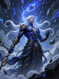 gfs, long hair, white hair, floating hair, chain, floating, 1boy, sfw, white skin, white eyes, original character, chain bracelet, male focus, bracelet, black rock shooter, jewelry, floating object, glowing, blue_eyes, glowing eyes, chain necklace, necklace, black rock shooter (character), glowing eyes, black rock shooter (series), solo, black hair, dark skin, glowing hair<lora:S-T-国风玄幻-S1.4:1>