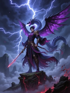 gfs, holding, chinese clothes, dragon, weapon, purple wings, holding weapon, 1boy, holding sword, purple eyes, chinese dragon, lightning, wings, standing, sfw, long sleeves, black hair, full body, holding_katana, cloud, original, male focus, sword, lightning_bolt, katana, dark, purple hair, black wings, solo, storm, looking at viewer<lora:S-T-国风玄幻-S1.4:1>