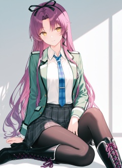 masterpiece,best quality,newest,absurdres,highres,soft shadows,year2024,(hiten \(hitenkei\):0.85),(mimoza \(96mimo414\):0.7),(fujiyama:0.8),(wanke:0.8),<lora:renne3in1XLNAI:1>,renne (\kuro\), kuro no kiseki, school uniform, 1girl, microskirt, purple hair, yellow eyes, long hair, black ribbon, hair ribbon, collared shirt, blue necktie, plaid skirt, cross-laced footwear, open jacket, black pantyhose, knee boots, high heel boots,