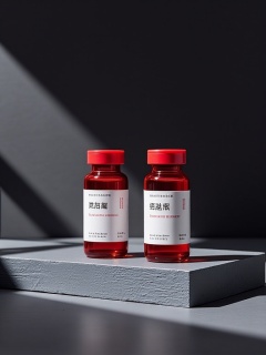 mzsas,two red glass vials with white labels, featuring black Chinese characters and English text, on a grey, textured platform against a dark grey background. The vials are placed at different angles, casting subtle shadows. The labels indicate the vials contain "SHAN A SHAN" extracts. The overall style is minimalist and modern.<lora:S-T-商业美妆-S1.4:1>