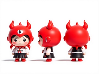 sstsas,Three view style,A photograph of three small, red, chibi-style figures with spiky red hair and horns, wearing traditional Japanese clothing. The figures are posed in a row, with the first figure on the left wearing a red helmet with the letter "K" on it, the second figure in the middle wearing a white shirt with black and red accents, and the third figure on either side wearing red boots. The background is a plain white, and all three figures have a playful, whimsical design. The style is reminiscent of Japanese anime and manga, with bright colors and exaggerated features.<lora:s-t-三视图设计-S1.4:1>