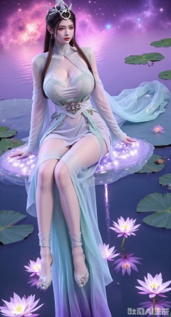(masterpiece, best quality:1.2),1girl,looking_at_viewer,huge_breasts,,long legs,realistic,A captivating fantasy elf portrait set in a surreal, floating garden in the sky. The elf, with iridescent, translucent wings like those of a dragonfly, sits gracefully on a floating crystal lily pad. Her flowing hair shimmers with every color of the rainbow and cascades down, merging with the floating flora around her. Her eyes are deep pools of starlight, and her delicate, silver gown is adorned with tiny, twinkling constellations. The garden is filled with glowing, bioluminescent flowers and whimsical, hovering orbs of light. The backdrop features a swirling nebula sky with vibrant hues of pink and purple, creating a dreamlike, cosmic atmosphere. The portrait combines elements of ethereal beauty and celestial wonder, blending fantasy with a touch of otherworldly magic.,high_heel,, argyle legwear,star \(symbol\,yeqingxian,brown hair,(huge breasts:2.99),(full breasts:2.99),hanfududou,Xsongzhihanfu,Xlujiajia