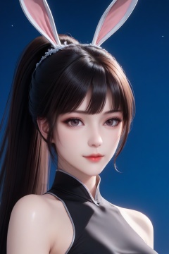 <lora:xiaowu_sl_v6-000024:0.7>,xiaowu_sl,1girl,solo,animal ears,rabbit ears,long hair,(white_skin:1.2),brown hair,black hair,closed mouth,medium breasts,shiny,pale skin,lips,lipstick,big eyes,eyelashes,long eyelashes,makeup,eyeshadow,high ponytail,nail polish,masterpiece,high quality,highres,absurdres,best quality,8K,high-res detailed,cheongsam,blue cheongsam,(loose clothes:1.2),skirt,chiffon_skirt,shorts_under_skirt,puffy_shorts,looking at viewer,standing,dynamic pose,seductive smile,night sky,[moon],star \(sky\),chinese style architecture,lantern,<lora:sh-glossy_r2:0.7>,pantyhose,thighband_pantyhose,shiny legwear,high heels,louboutin heels,black heels,red bottom heels,footwear,<lora:Louboutin_Heels__PONY:0.5>,<lora:HandFixer_pdxl_Incrs_v1:0.5>,handfixer,<lora:DetailedEyes_V3:0.5>,