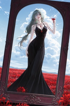 best quality,masterpiece,(ultra-detailed),(high detailed skin),border,oil painting border,photo frame,frame,a carefully framed painting,safe,extra_sharp,(perspective composition.:1.2),(bold_lines are adding to the overall style:1.2) solo,(high brightness:1.3),backlighting,spider lily field,outdoors,kubrick stare,1girl,contrapposto,half-closed eyes,detailed eyes,bold eyelashes,long eyelashes,nose,closed mouth,wide grin,smile,long hair,blue sky,clouds,amazing quality,masterpiece,highres,beautiful color,film grain,newest,symmetrical composition,beautiful,intricate,amazing quality,very aesthetic,absurdres,masterpiece,by anna dittmann,full body,dynamic angle,chromatic aberration,white skin,glossy skin,beautiful eyes,<lora:hanf-ill-Tanger:0.8>,artist: hanf,1girl,solo,jewelry,cup,red lips,earrings,long hair,drinking glass,wine glass,holding,necklace,red nails,makeup,holding cup,black dress,<lora:Phrolova-ill-Tanger-000014:0.9>,Phrolova \(Wuthering Waves\),left-arm-only arcane sigils,black tattoo-like markings,bandaged eye,gray-green hair,1girl,long hair,purple eyes,transparent background,