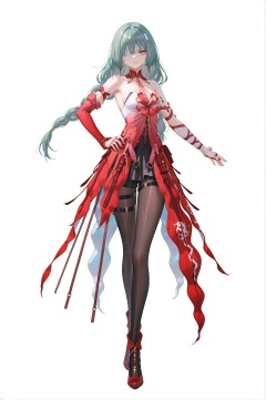 8k,best quality,masterpiece,(ultra-detailed),(high detailed skin),((artist:reoen),(artist:fuzichoco),(artist:atdan),(artist:torino_aqua),year 2024:0.8)1girl,[artist:wlop],[artist:ningen_mame],artist:ciloranko,[[artist:rhasta]],artist:tidsean,colorful,jijia,2d,ambient light,full body,full shot,standing,looking at viewer,(solo:1.2),simple background,(white background:1.2),hand on own hip,(white background:1.1),<lora:Phrolova-ill-Tanger-000014:0.9>,Phrolova \(Wuthering Waves\),clothes: Phrolovadef red dress,left-arm-only arcane sigils,black tattoo-like markings,bandaged eye,asymmetrical outfit,black pantyhose,gray-green hair,1girl,long hair,purple eyes,bandages,asymmetrical detached sleeves,