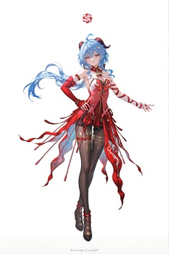 8k,best quality,masterpiece,(ultra-detailed),(high detailed skin),((artist:reoen),(artist:fuzichoco),(artist:atdan),(artist:torino_aqua),year 2024:0.8)1girl,[artist:wlop],[artist:ningen_mame],artist:ciloranko,[[artist:rhasta]],artist:tidsean,colorful,jijia,2d,ambient light,full body,full shot,standing,looking at viewer,(solo:1.2),simple background,(white background:1.2),hand on own hip,(white background:1.1),ganyu \(genshin impact\), <lora:Phrolova-ill-Tanger-000014:0.9>,clothes: Phrolovadef red dress, black pantyhose, hair,bandages,asymmetrical detached sleeves